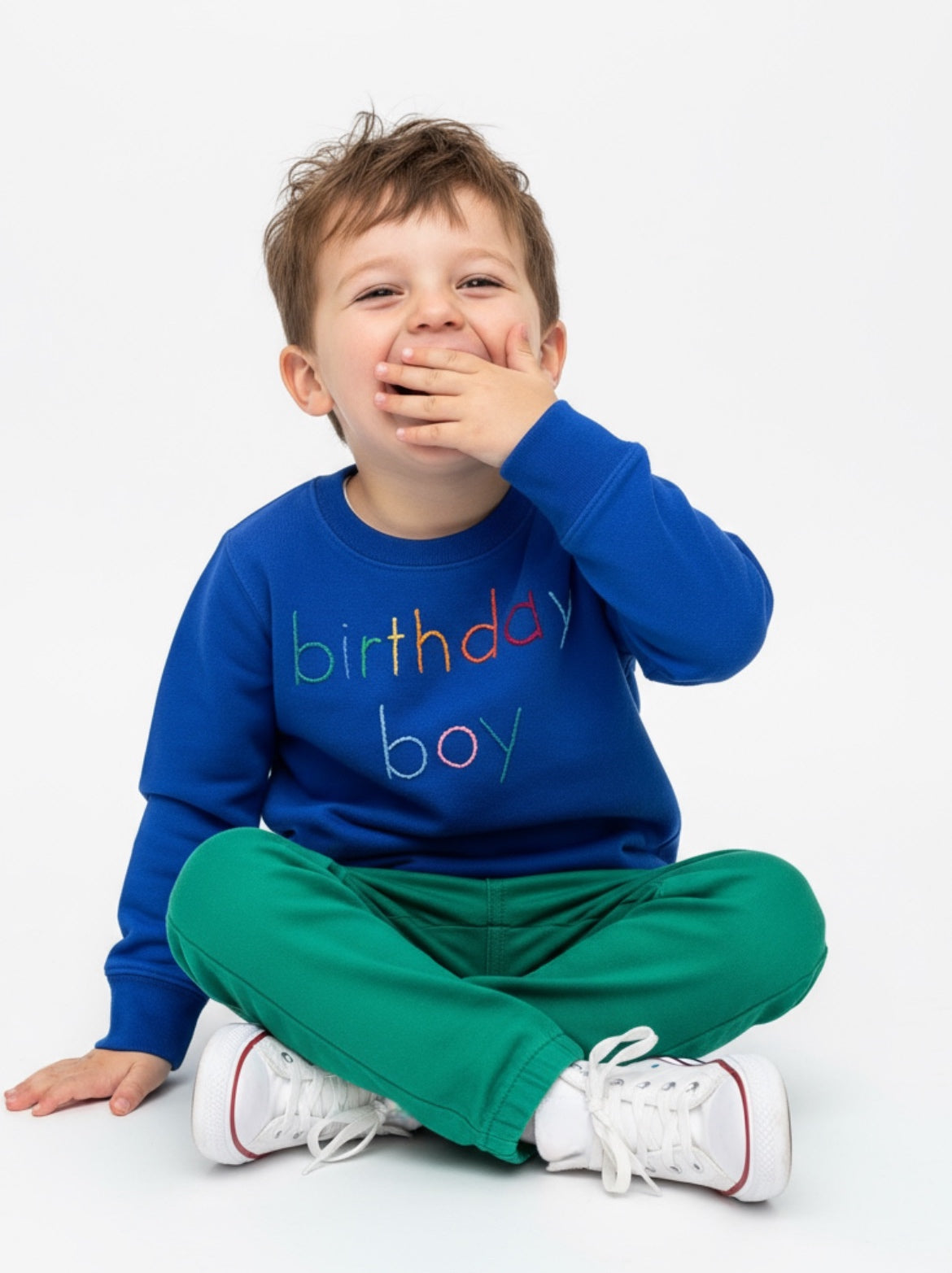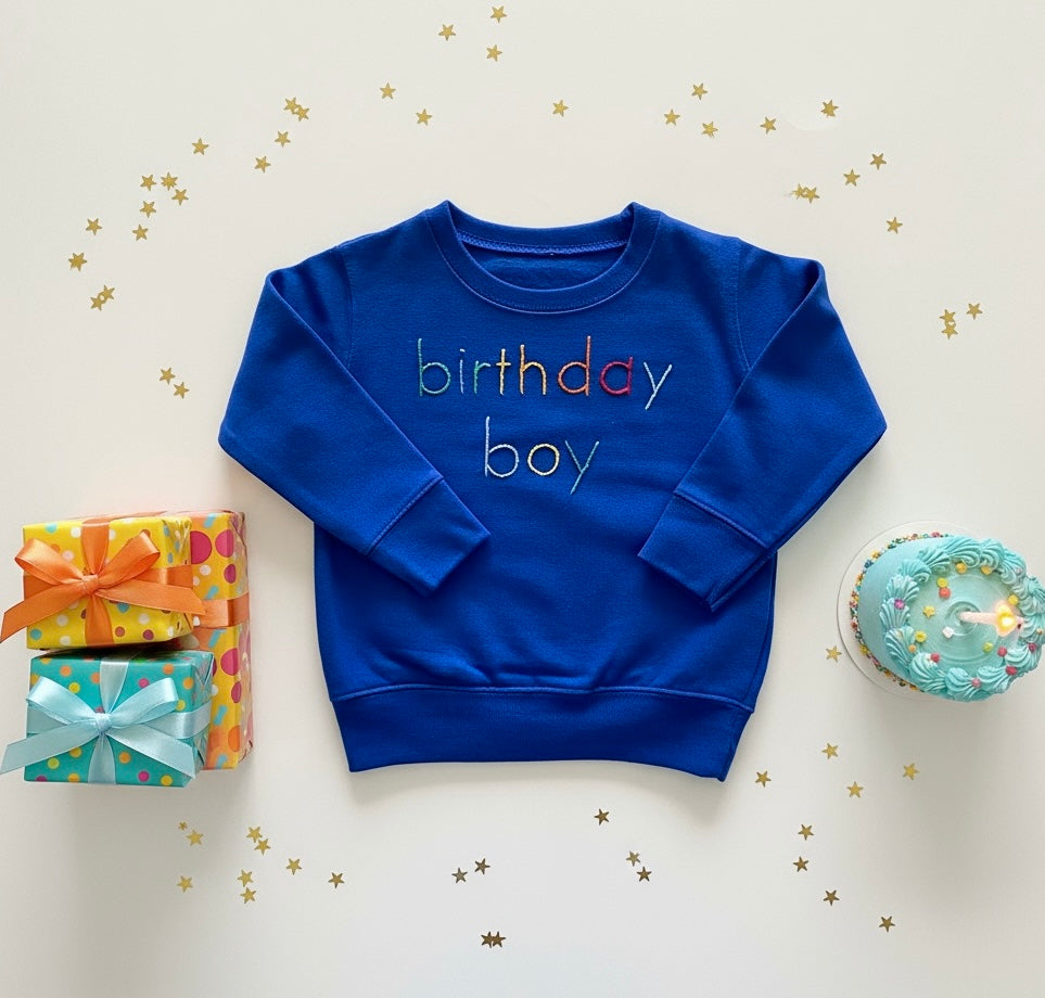 Birthday Boy - blue sweatshirt - rainbow hand embroidered letters