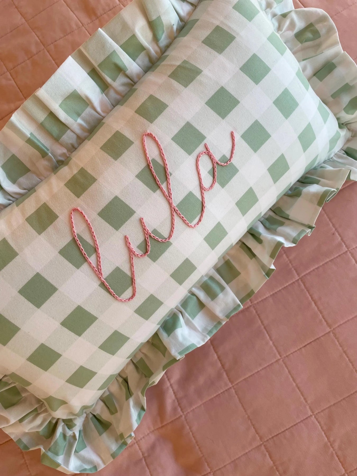 Light Green Gingham Ruffle Pillowcase with Personalized Name- Hand Embroidered