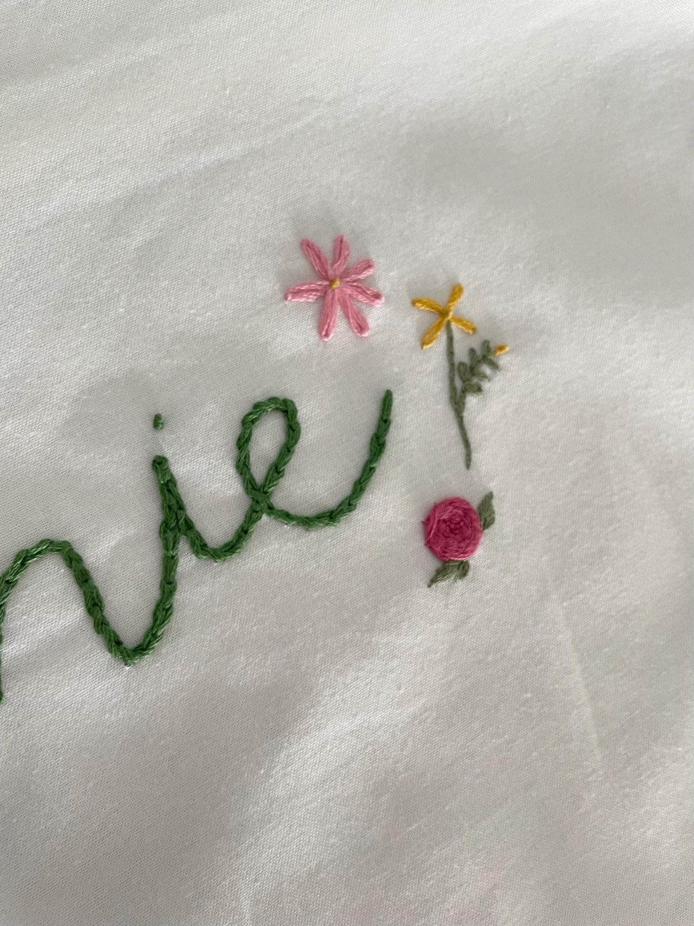 All names are hand embroidered across the middle. You can choose to have name in dark green or pink thread.