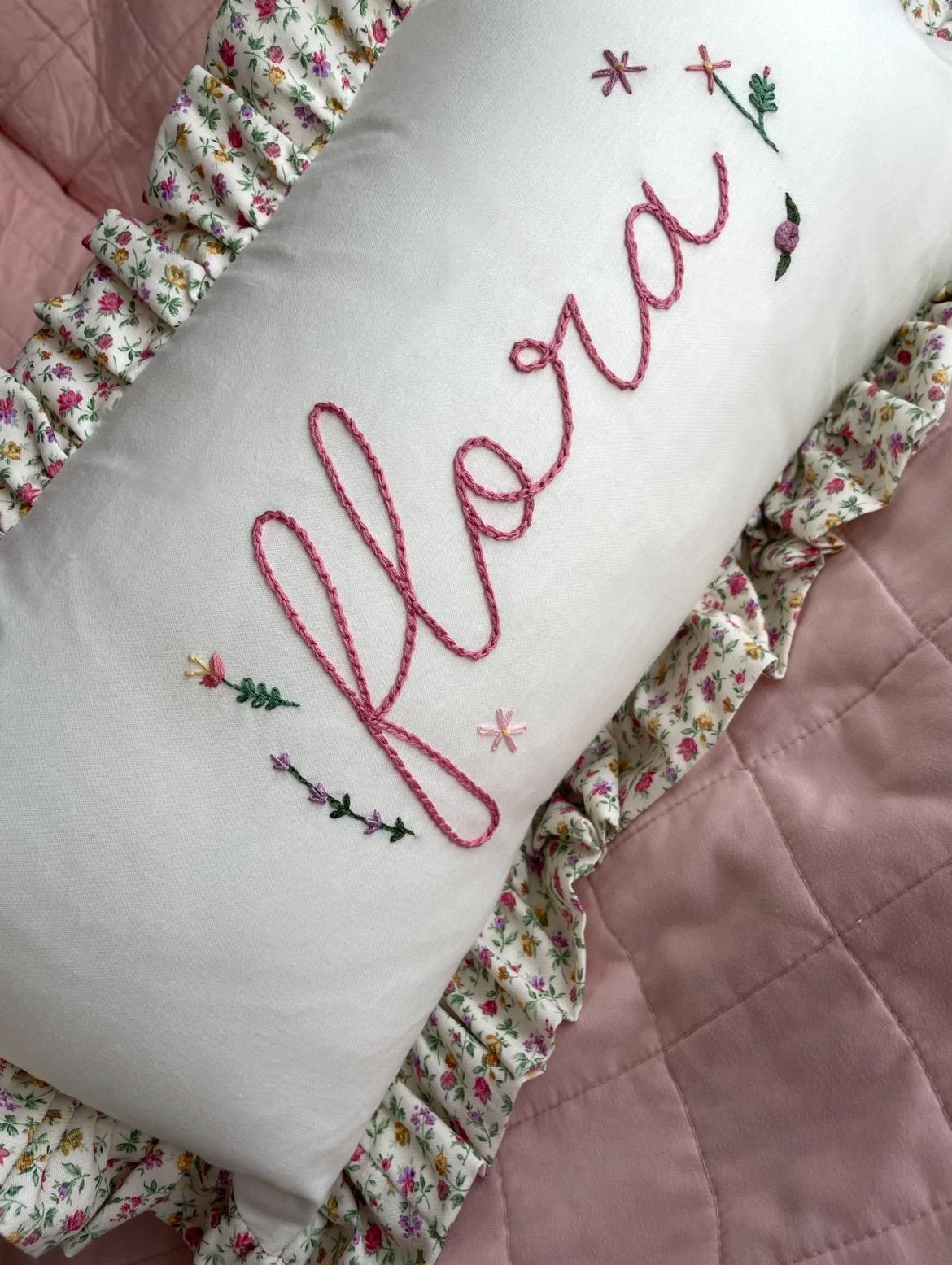 Floral Ruffle Pillowcase with personalized name- Hand Embroidered